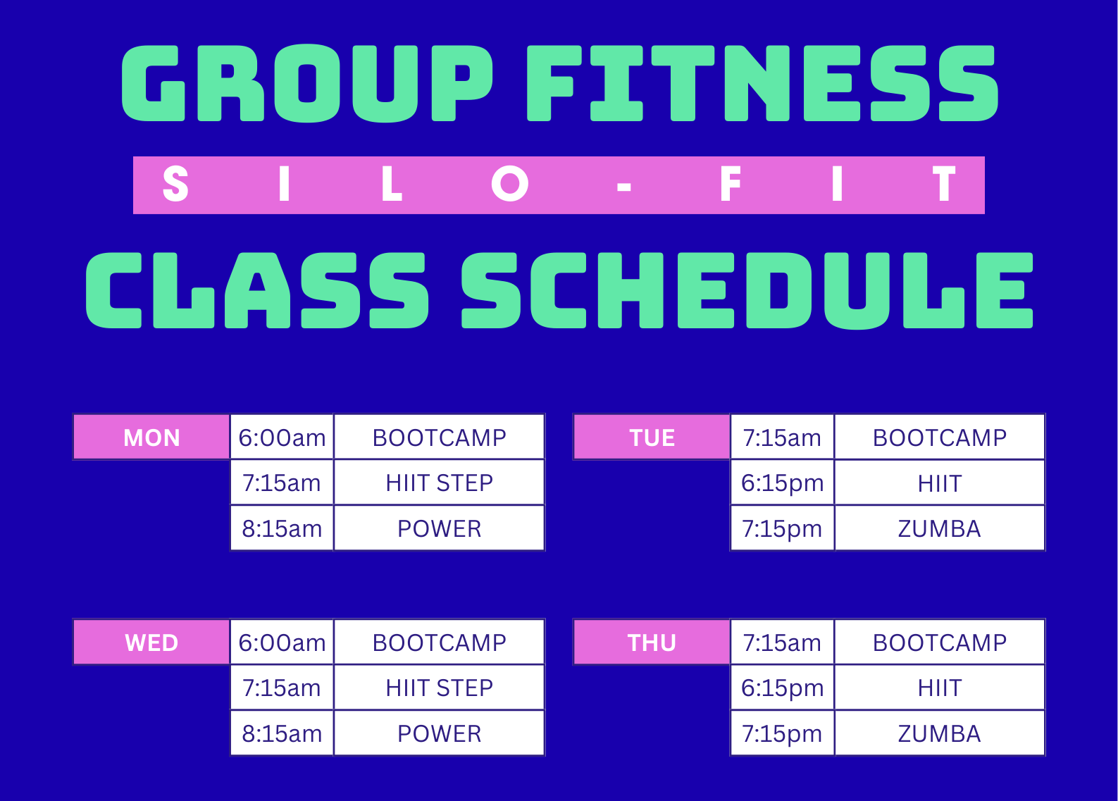 Push your limits, stay motivated, and thrive in our dynamic group fitness classes at Silo-Fit! From the full-body burn of BOOTCAMP and the heart-pounding pace of HIIT and HIIT Step, to the muscle-sculpting focus of POWER, the mind-body balance of YOGA, and the high-energy, dance-fueled fun of ZUMBA, there’s something for every fitness level and goal. Our expert instructors lead energizing sessions that challenge and inspire—whether you’re just getting started or looking to level up your routine.